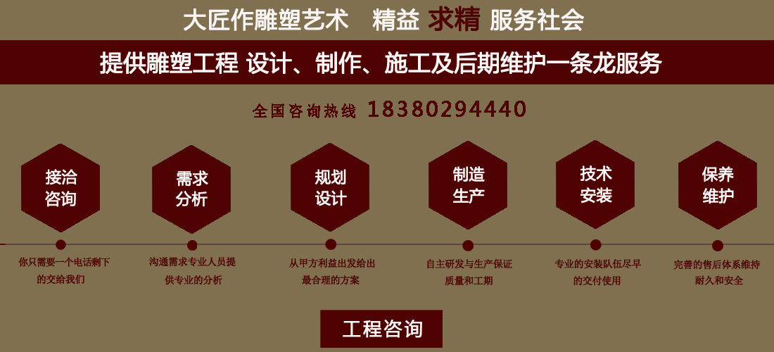 成都大匠作雕塑有限公司,是經成都工商局審定注冊的正規專業雕塑制作及工程安裝服務機構,是由一群年輕富有朝氣的年輕人創辦,發軔于四川省成都市龍泉驛區。它是一家******于創作、制作和銷售為一體的公司。大匠作擁有多年從事公共藝術的專業人員和雕塑制作人組成的核心團隊,為您提供專業、具創新的設計及制作服務。公司成立以來,秉承“******服務、誠信為本”的宗旨,以客戶需求為目標導向,不斷學習,進取,優化和提高服務質量,公司向您******——“您的滿意***是我們的信譽”,我們將以飽滿的熱情和******的服務贏得您的贊譽和支持。